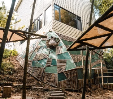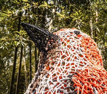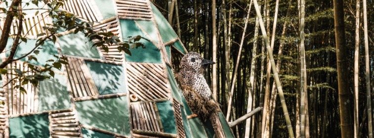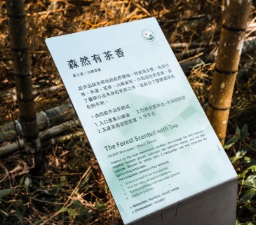 自綿延的山巒轉入瑞峰休閒農業區,藝術家黃文淵於此創作《森然有茶香》,以竹林、茶園與山雀為靈感,打造一場融合自然與人文的竹藝體驗。作品由四個主題區組成,入口以「山麻雀」造型迎賓,象徵山林生態的靈動氣息,步道沿線以水波紋竹編裝飾,呼應溪谷的流動節奏。而中央的竹平台與五座散布林間的茶席,則提供遊客在此歇息、品茗的自然交流空間。當竹與茶、風與光在此相互交織,整個空間也成為沉靜又充滿生命律動的「茶林詩境」。