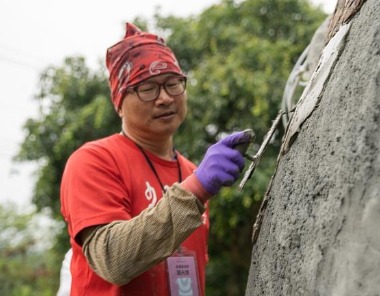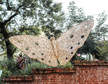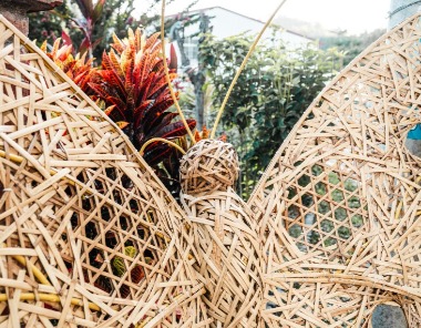蜈蚣社區的楓香公園以蝶舞花香揭開序幕,藝術家羅元鴻以蝴蝶與蜜源植物的共生為靈感,創作出竹藝裝置《花若盛開,蝴蝶自來》,作品運用竹與鐵材交織成動態的生命姿態,象徵自然與人共榮的節奏。當陽光穿透竹影,竹構彷彿化作展翅的蝴蝶,在公園的綠意間翩然起舞。